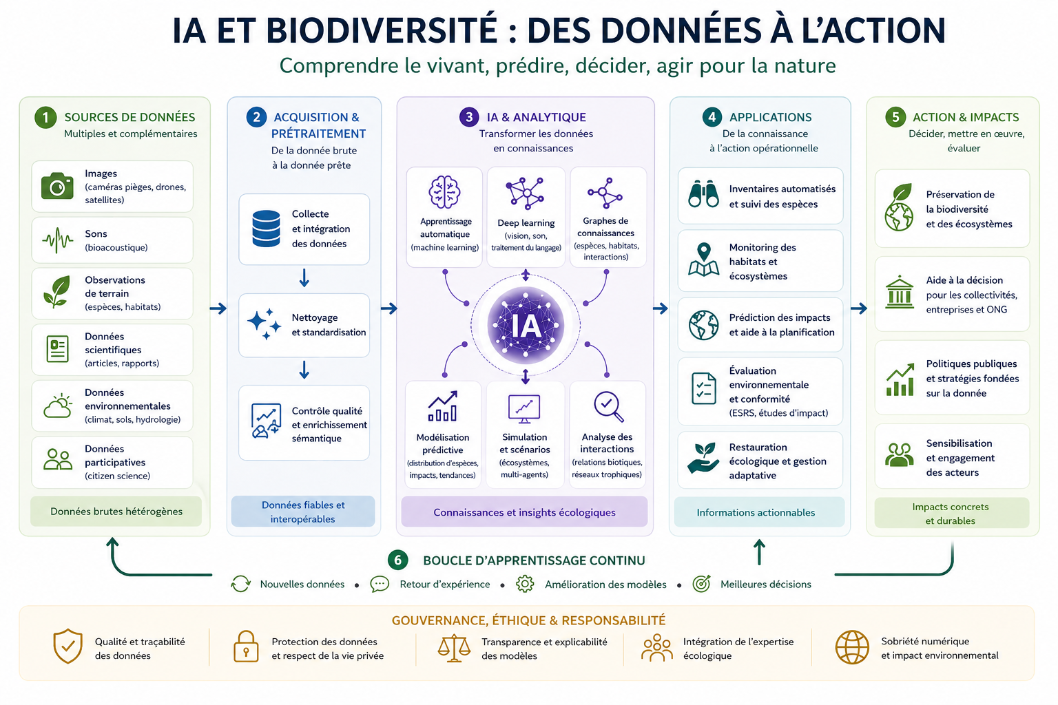 L’intelligence artificielle constitue aujourd’hui un levier majeur pour la compréhension et la gestion de la biodiversité. Elle permet de structurer des données complexes, de produire des connaissances à grande échelle et de soutenir des décisions plus éclairées.